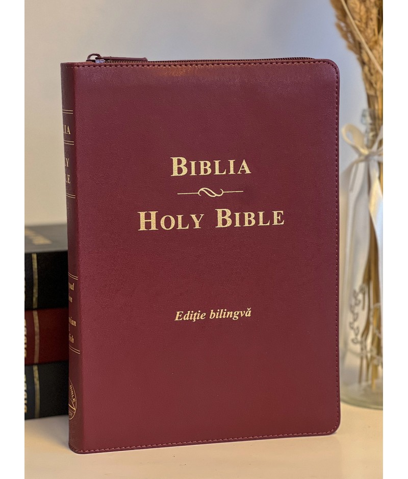 Biblie mare, bilingvă română-engleză, visinie, cu fermoar